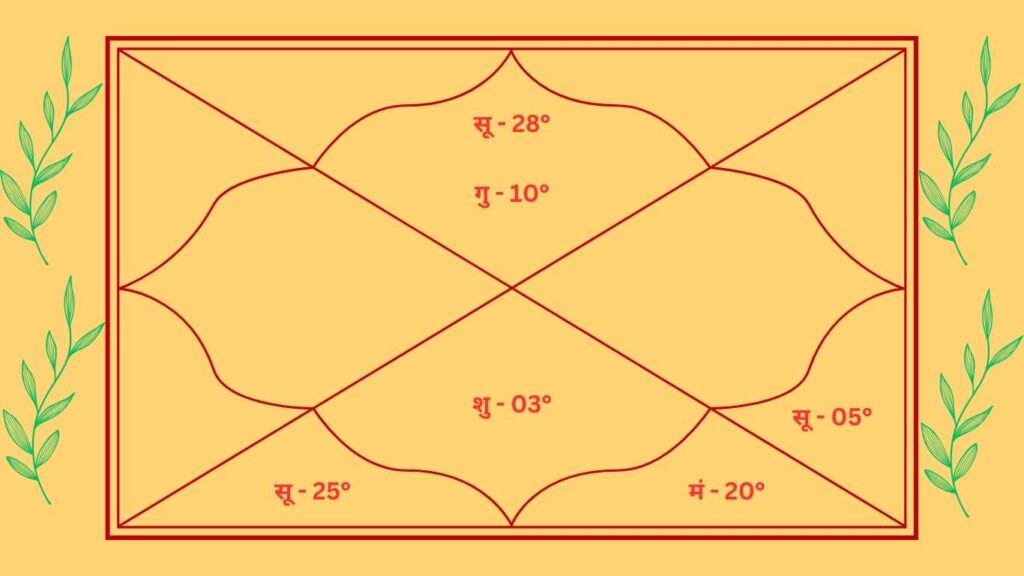 → पिछले घर में ग्रह को उस घर के अंत तक जाने वाली डिग्री + सूर्य की डिग्री जोड़ो।