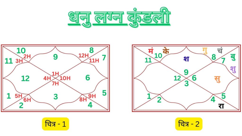 1. ये धनु लग्न की कुंडली है क्योंकि 1H = पहले घर में, 9(धनु राशि) है; यहाँ चित्र – 1 में आपको समझाने हेतु क्रमशः 1H, 2H, 3H……. 12H लिखा है लेकिन कहीं कभी ऐसा लिखा नहीं होता है और जब हम आगे के लेखों में बात करेंगे तो हम भी नहीं लिखेंगे। लग्न क्या होता है? ये हमने कुंडली का लग्न: शक्ति और संघर्ष वाले लेख से समझा था।
