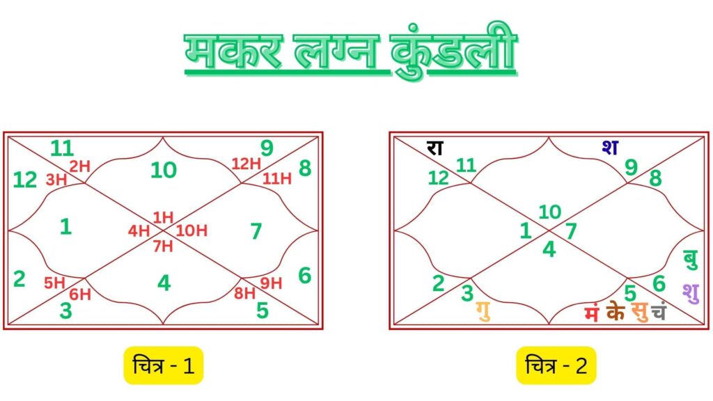1. ये मकर लग्न की कुंडली है क्योंकि 1H = पहले घर में, 10(मकर राशि) है; यहाँ चित्र – 1 में आपको समझाने हेतु क्रमशः 1H, 2H, 3H……. 12H लिखा है लेकिन कहीं कभी ऐसा लिखा नहीं होता है और जब हम आगे के लेखों में बात करेंगे तो हम भी नहीं लिखेंगे। लग्न क्या होता है? ये हमने कुंडली का लग्न: शक्ति और संघर्ष वाले लेख से समझा था।
