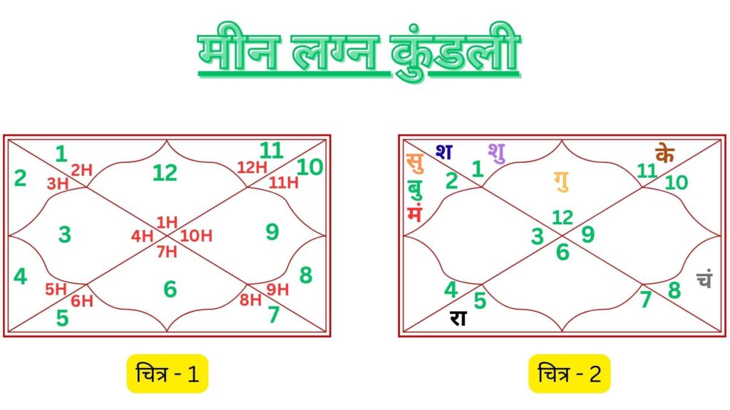 1. ये मीन लग्न की कुंडली है क्योंकि 1H = पहले घर में, 12(मीन राशि) है; यहाँ चित्र – 1 में आपको समझाने हेतु क्रमशः 1H, 2H, 3H……. 12H लिखा है लेकिन कहीं कभी ऐसा लिखा नहीं होता है और जब हम आगे के लेखों में बात करेंगे तो हम भी नहीं लिखेंगे। लग्न क्या होता है? ये हमने कुंडली का लग्न: शक्ति और संघर्ष वाले लेख से समझा था।