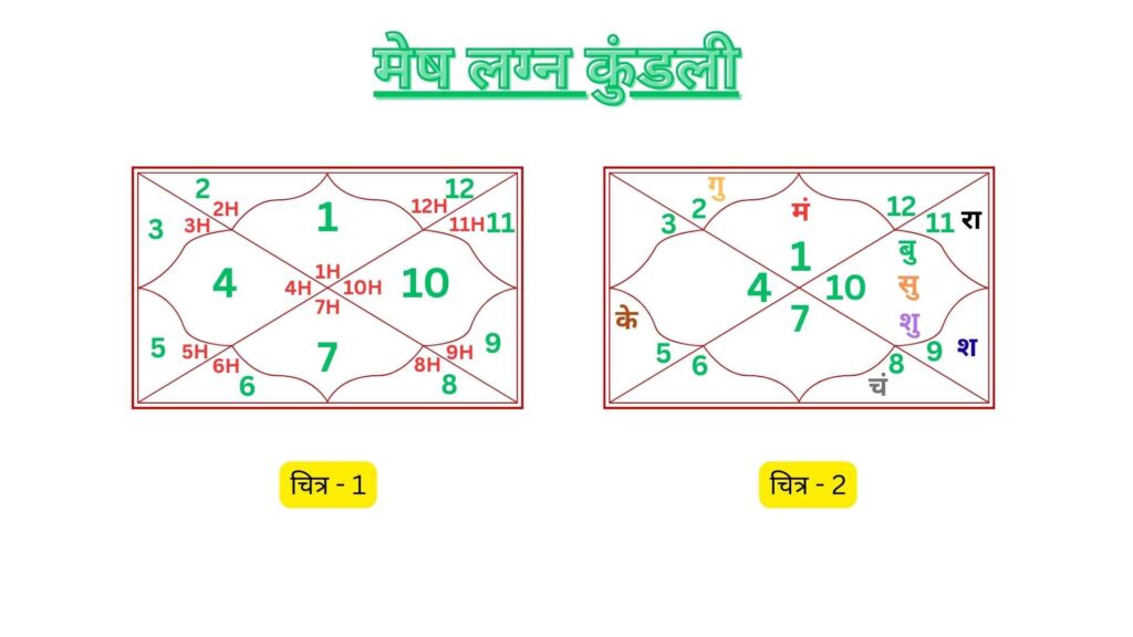 - ये मेष लग्न की कुंडली है क्योंकि 1H = पहले घर में, 1(मेष राशि) है; यहाँ चित्र – 1 में आपको समझाने हेतु क्रमशः 1H, 2H, 3H……. 12H लिखा है लेकिन कहीं कभी ऐसा लिखा नहीं होता है और जब हम वृषभ लग्न कुंडली की बात करेंगे तो हम भी नहीं लिखेंगे। लग्न क्या होता है? ये हमने कुंडली का लग्न: शक्ति और संघर्ष वाले लेख से समझा था।