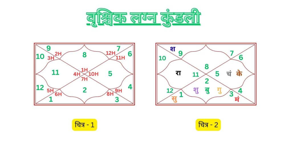 1. ये वृश्चिक लग्न की कुंडली है क्योंकि 1H = पहले घर में, 8(वृश्चिक राशि) है; यहाँ चित्र – 1 में आपको समझाने हेतु क्रमशः 1H, 2H, 3H……. 12H लिखा है लेकिन कहीं कभी ऐसा लिखा नहीं होता है और जब हम आगे के लेखों में बात करेंगे तो हम भी नहीं लिखेंगे। लग्न क्या होता है? ये हमने कुंडली का लग्न: शक्ति और संघर्ष वाले लेख से समझा था।